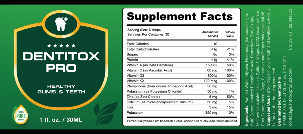 Dentitox Pro is a natural liquid supplement designed to improve oral health by strengthening teeth and gums with vitamins and minerals.